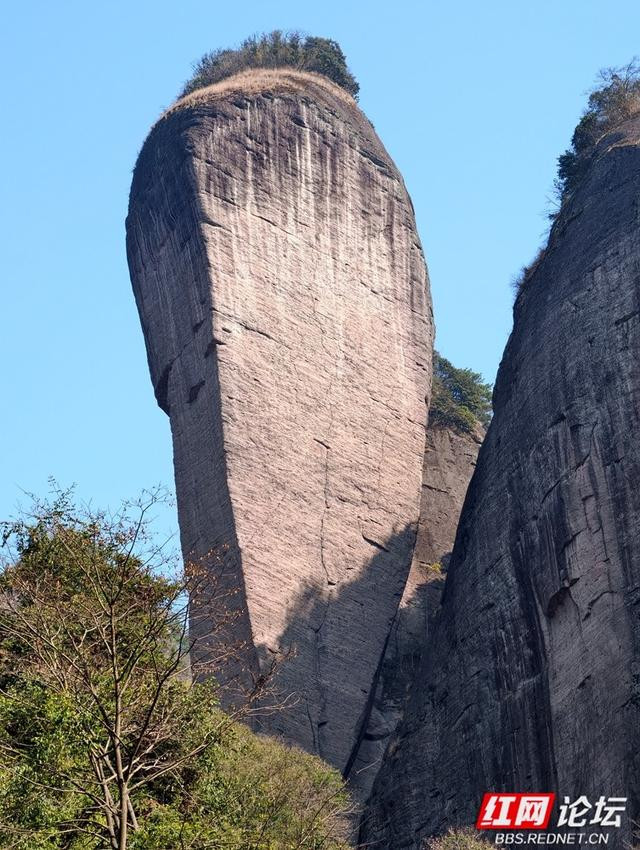 第一站是辣椒石。这块横跨湘桂两省视野的巨石,在广西那边瞧着方方正正地嵌在山顶;到了湖南这边,却被游客唤作“辣椒石”。在我看来,它更像一截破土而出的白萝卜——通体岩石灰白,孤零零从石缝中拔地而起,那股子倔强奇崛的劲儿,着实值得驻足端详许久。
