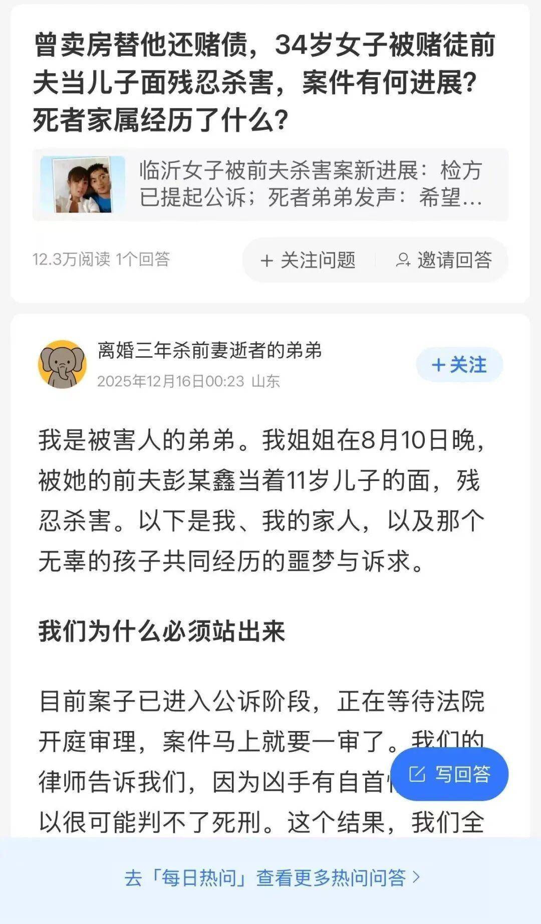 来先生在腾讯热问发声。图/腾讯热问截图律师称被告人可能无法判处死刑,家属表示难以接受回忆起姐姐这段失败的婚姻,来先生感到愤怒,他不明白,姐姐没有做错任何事,为什么会被婚姻中的过错方残忍杀害。“我姐姐和前夫是相亲认识的,觉得相处不错就结婚了,婚后彩礼全部返还,给男方配了车,甚至买房子时,我们家也添了钱,绝对是没有亏待他的,结果这个男人居然在工地染上了赌博的恶习,除了跟工友打牌,还参与各种网络赌博。”最初发现时,李秋考虑到孩子还小,想维系这段婚姻,卖房替前夫还了钱,彭某鑫也承诺不会再犯,然而过了两年好日子,彭某鑫又开始赌博,李秋用信用卡帮忙还了几次,但依然接到催债电话,李秋感到怀疑,便前往银行查征信,彭某鑫这才在银行门口坦白自己已欠上百万元赌债,李秋忍无可忍,决定离婚。来先生告诉九派新闻,离婚后,彭某鑫一分钱抚养费不给,姐姐要养育小孩,还房贷,还要帮前夫还欠款。“我姐姐本来是做幼师的,但2000多元的工资根本支撑不了,她后来开始一天打多份工,直到今年,终于把房贷和欠债还清了,她的订婚对象对她和孩子都很好,因此她今年的笑容格外多。”来先生以为姐姐终于能拥有幸福,但不幸却比幸福先降临。“彭某鑫自己债务累累,还见不得我姐姐过得好,离婚了也不放过她,他想报复至少留她一命,这样我们还能忍受,但他捅了二十几刀,根本就是冲着要我姐姐命去的。”李秋的卧室里装有监控,记录下了案发现场,事发至今,来先生只完整地看过一次监控视频,姐姐的惨状令他不敢再看。他转述道:“彭某鑫进屋后语气很平静,说‘你跟我和好吧’,我姐说自己订婚了,他又说‘你跟我和好吧’,我姐几秒钟没说话,突然刀就捅过来了,等杀完人之后他就开始抽烟,没有去给我姐姐做急救措施,再然后他就报了警,说自己杀人了。”来先生不清楚彭某鑫的杀机何在,如果是因为姐姐再婚,彭某鑫为什么不自我了断殉情,反而是要报警自首,“律师跟我说,因为被告人有自首情节,可能会因此减刑,无法被判死刑立即执行,我不知道彭某鑫是不是清楚自首能减刑,总之我和家里人都接受不了这种结果。”在来先生看来,彭某鑫哪怕是被判死缓,在狱中表现好也有机会出狱,那么年老丧失工作能力的彭某鑫势必会缠上他的儿子。“离婚之前,彭某鑫在外地工作很少回家,对孩子陪伴本就不多,事发时他还诱骗孩子开门,我是不可能让他有机会威胁我外甥的,我们家只希望孩子健康成长,慢慢让内心的伤口愈合。”来先生表示,彭某鑫四处欠债没钱赔偿,其父母态度也很蛮横。“我们去找他家里人就会被骂,每次都让我们滚,我们现在也不需要赔偿了,就希望彭某鑫被重判。”来源:九派新闻举报/反馈